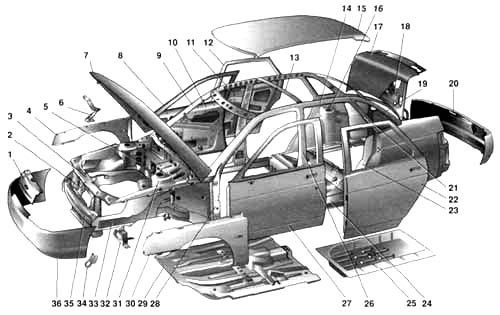 1. решетка радиатора; 2. рамка радиатора; 3. верхняя поперечина рамки радиатора; 4. правое переднее крыло; 5. щиток передка; 6. петля капота; 7. капот; 8. правая передняя дверь; 9. стойка ветрового окна; 10. внутренняя панель передней двери; 11. внутренняя панель задней двери; 12. правая задняя дверь; 13. усилитель крыши; 14. левая боковина; 15. панель крыши; 16. опора пружины задней подвески; 17. крышка багажника; 18. внутренняя панель крышки багажника; 19. рамка окна боковины; 20. задний бампер; 21. задняя стойка; 22. левая задняя дверь; 23. арка заднего колеса; 24. средний пол; 25. ниша запасного колеса; 26. центральная стойка; 27. левая передняя дверь; 28. передняя стойка; 29. передний пол; 30. левое переднее крыло; 31. опора пружины передней подвески; 32. кронштейн; 33. передний лонжерон; 34. кронштейн проушины для буксировки; 35. панель передка; 36. передний бампер.