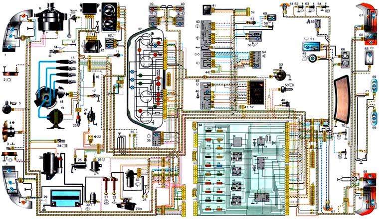 1. блок-фара; 2. датчики износа колодок передних тормозов; 3. датчик включения электродвигателя вентилятора; 4. электродвигатель вентилятора системы охлаждения двигателя; 5. звуковой сигнал; 6. генератор: 7. датчик уровня масла; 8. блок управления электромагнитным клапаном карбюратора; 9. контроллер отопителя; 10. выключатель клапана рециркуляции; 11. лампа подсветки рычагов управления отопителем; 12. коммутатор; 13. концевой выключатель карбюратора; 14. датчик контрольной лампы давления масла; 15. свечи зажигания; 16. электромагнитный клапан карбюратора; 17. датчик указателя температуры охлаждающей жидкости; 18. датчик-распределитель зажигания; 19. катушка зажигания; 20. стартер; 21. электродвигатель вентилятора отопителя; 22. дополнительный резистор электродвигателя отопителя; 23. датчик скорости; 24. выключатель света заднего хода; 25. микромоторедуктор привода заслонки отопителя; 26. клапан рециркуляции; 27. датчик уровня тормозной жидкости; 28. колодки для подключения электродвигателя омывателя заднего стекла; 29. аккумуляторная батарея; 30. электродвигатель смывателя ветрового стекла; 31. датчик уровня омывающей жидкости; 32. датчик уровня охлаждающей жидкости; 33. моторедуктор очистителя ветрового стекла; 34. монтажный блок: 35. колодки для подключения жгута предупредительного света; 36. переключатель наружного освещения; 37. комбинация приборов; 38. выключатель заднего противотуманного света; 39. контрольная лампа противотуманного света; 40. контрольная лампа обогрева заднего стекла; 41. часы; 42. выключатель обогрева заднего стекла; 43. подрулевой переключатель; 44. колодка для переключения проводов при установке блок-фар другого типа; 45. регулятор освещения приборов; 46. выключатель зажигания; 47. колодки для подключения жгута проводов очистителей фар; 48. розетка для переносной лампы; 49. плафон индивидуального освещения салона; 50. выключатель стоп-сигнала; 51. плафон освещения салона; 52. блок бортовой системы контроля; 53. датчик указателя уровня топлива; 54. выключатель аварийной сигнализации; 55. датчик ремня безопасности водителя; 56. прикуриватель; 57. лампа подсветки пепельницы; 58. выключатель лампы освещения вещевого ящика; 59. колодка для подключения бортового компьютера; 60. лампа освещения вещевого ящика; 61. боковые указатели поворота; 62. выключатели в стойках передних дверей; 63. выключатели в стойках задних дверей; 64. выключатель контрольной лампы стояночного тормоза; 65. фонарь освещения багажника; 66. датчик температуры для системы отопления; 67. наружные задние фонари; 68. внутренние задние фонари; 69. фонари освещения номерного знака; 70. элемент обогрева заднего стекла; 71. колодка для подключения дополнительного стоп-сигнала; В жгуте проводов панели приборов вторые концы проводов белого, черного, оранжевого цветов, белого с красной полоской и желтого с голубой полоской соединены между собой в одних точках. Схемы электрооборудования автомобилей ВАЗ-2III и ВАЗ-2112 отличаются (за исключением системы управления двигателем) только добавлением очистителя и омывателя двери задка. |