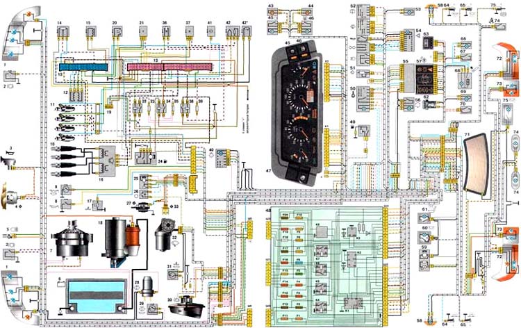 1. блок-фара; 2. датчики износа колодок передних тормозов; 3. звуковой сигнал; 4. вентилятор системы охлаждения; 5. выключатель света заднего хода; 6. аккумуляторная батарея; 9. генератор: 8. датчик контрольной лампы давления масла; 9. датчик уровня масла; 10. свечи зажигания; 11. форсунки; 12. регулятор холостого хода; 13. колодки электронного блока управления; 14. датчик положения дроссельной заслонки; 15. датчик положения коленчатого вала; 16. модуль зажигания; 17. датчик указателя температуры охлаждающей жидкости; 18. стартер; 19. колодка диагностики; 20. датчик температуры охлаждающей жидкости; 21. датчик скорости; 22. реле включения бензонасоса; 23, 35, 39. плавкие предохранители; 24. электробензонасос; 25. микромоторедуктор привода заслонки отопителя; 26. клапан рециркуляции; 27. вентилятор отопителя; 28. насос омывателя ветрового стекла; 29. датчик уровня омывающей жидкости; 30. датчик уровня тормозной жидкости; 31. датчик уровня охлаждающей жидкости; 32. моторедуктор стеклоочистителя; 33. дополнительный резистор вентилятора отопителя; 34. реле включения питания системы впрыска; 36. клапан продувки адсорбера; 37. датчик расхода воздуха; 38. реле включения вентилятора системы охлаждения; 40. переключатель наружного освещения; 41. датчик детонации; 42. датчик концентрации кислорода (подогреваемый лямбда-зонд); 42*. СО-потенциометр (ставится на машинах, эксплуатируемых на этилированном бензине, в этом случае датчик концентрации кислорода не устанавливается); 43. контрольная лампа противотуманного света; 44. контрольная лампа обогрева заднего стекла; 45. выключатель противотуманного света; 46. выключатель обогрева заднего стекла; 47. комбинация приборов; 48. монтажный блок; 49. датчик уровня топлива; 50. выключатель зажигания; 51. регулятор яркости подсветки приборов; 52. подрулевой переключатель; 53. лампа подсветки рычагов управления отопителем; 54. выключатель аварийной сигнализации; 55. электронный блок управления отопителем; 56. выключатель клапана рециркуляции топлива; 57. блок индикации бортовой системы контроля; 58. боковые указатели поворота; 59. датчик температуры для системы отопления; 60. плафон освещения салона; 61. плафон местного освещения салона; 62. розетка для переносной лампы; 63. электронные часы; 64. дверные выключатели передних дверей; 65. дверные выключатели задних дверей; 66. лампа освещения вещевого ящика; 67. выключатель освещения вещевого ящика; 68. прикуриватель; 69. лампа освещения пепельницы; 70. выключатель стоп-сигнала; 71. элемент обогрева заднего стекла; 72. наружные задние фонари; 73. внутренние задние фонари; 74. лампы освещения номерного знака; 75. лампа освещения багажника. |