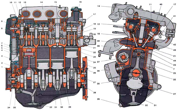 1. шкив привода генератора (демпфер); 2. масляный насос; 3. зубчатый шкив насоса охлаждающей жидкости; 4. ремень привода механизма газораспределения; 5. натяжной ролик; 6. передняя крышка привода механизма газораспределения; 7. поршневой палец; 8. зубчатый шкив распределительного вала; 9. сальник распределительного вала; 10. задняя крышка привода распределительного вала; 11. крышка головки блока цилиндров; 12. выпускной распределительный вал; 13. крышка подшипника распределительного вала; 14. ресивер; 15. направляющая труба; 16. крышка маслозаливной горловины; 17. гидротолкатель; 18. пружина клапана; 19. клапан; 20. отводящий патрубок рубашки охлаждения; 21. головка цилиндров; 22. блок цилиндров; 23. поршень; 24. маховик; 25. шатун; 26. держатель заднего пальника коленчатого вала; 27. коленчатый вал; 28. задний сальник коленчатого вала; 29. крышка коренного подшипника; 30. крышка шатуна; 31. поддон картера; 32. приемник масляного насоса; 33. передний сальник коленчатого вала; 34. зубчатый шкив коленчатого вала; 35. пробка сливного отверстия поддона картера; 36. масляный фильтр; 37. насос охлаждающей жидкости; 38. выпускной коллектор; 39. выпускной клапан; 40. впускной распределительный вал; 41. форсунка; 42. впускной коллектор; 43. направляющая втулка клапана; 44. впускной клапан.