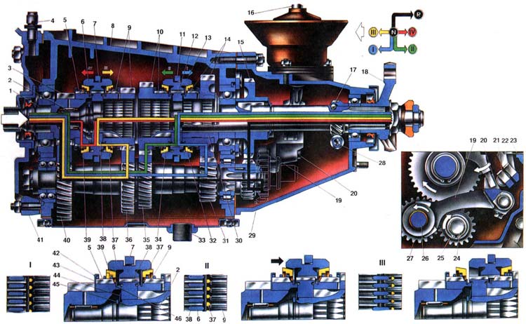 Принцип работы шестеренчатой коробки передач основан на изменении зацепления тех пар шестерен, которые участвуют в передаче крутящего момента от первичного вала 1 на вторичный вал 2. Это достигается перемещением скользящих муфт 6 и 13 синхронизаторов или промежуточной шестерни 27 заднего хода при помощи рычага переключения передач. При этом изменяются передаточные числа шестерен, а значит и величина передаваемого крутящего момента. На прямой четвертой передаче крутящий момент, передаваемый на ведущие колеса автомобиля, практически равен крутящему моменту на коленчатом валу двигателя. На первой передаче момент увеличивается в 3,75 раза, на второй в 2,30 раза, на третьей в 1,49 раза, а при включении задней передачи в 3,87 раза. При нейтральном положении рычага переключения передач крутящий момент на вторичный вал не передается. Но так как двигатель работает и сцепление включено, то вращение от первичного вала 1 передается на промежуточный вал через шестерни 3 и 40 постоянного зацепления. От шестерен 31, 35 и 36 промежуточного вала вращение передается на шестерни 14, 10 и 9 вторичного вала. Так как эти шестерни с валом 2 непосредственно не связаны, то они будут свободно вращаться на вторичном валу. Соединение этих шестерен с валом 2 осуществляется через синхронизаторы. При включении первой передачи усилие от рычага переключения передач через шток и вилку И передается на скользящую муфту 13. Перемещаясь по шлицам своей ступицы 12, муфта входит в зацепление с прямозубым венцом шестерни 14. Таким образом, муфта синхронизатора соединит между собой ступицу 12 и шестерню 14. А так как ступица 12 жестко связана с валом 2, то крутящий момент от шестерни 14 через муфту 13 передается на ступицу 12 и от нее на вторичный вал коробки передач. При включении второй передачи муфта 13 соединим ступицу 12 с прямозубым венцом шестерни 10, и крутящий момент передается от шестерни 10 на ступиц 12 и на вторичный вал. Третья и четвертая передачи включаются другим синхронизатором. При включении третьей передачи крутящий момент от первичного вала через шестерни 36 и 9 передается через муфту 6 на ступицу 38 и затем на вторичный вал. Четвертая передача называется прямой, так как крутящий момент передается непосредственно с первичного вала 1 на вторичный вал 2, минуя шестерни промежуточного вала. В этом случае муфта 6 соединяет между собой зубчатый венец 5 первичного вала со ступицей 38. Частота вращения обоих валов будет одинаковой, а величина крутящего момента, передаваемого от двигателя на ведущие колеса, не изменится. При включении задней передачи усилие от рычага переключения передач через шток 20 и вилку 19 передается на промежуточную шестерню 27. Перемещаясь на оси 26, она соединит между собой шестерни 25 и 15 заднего хода, и крутящий момент передается от первичного вала через шестерни 5 и 40 на промежуточный вал и далее через шестерни 25, 27 и 15 на вторичный вал. При этом последний будет вращаться в обратном направлении, обеспечивая обратное вращение ведущих колес автомобиля. Как видно из схемы работы коробки передач, все передачи переднего хода синхронизированы. Принцип действия синхронизатора при включении третьей передачи показан на схемах 1, 11, III. При нейтральном положении рычага переключения передач (см. схему 1) между скользящей муфтой 6 и блокирующими кольцами 37 имеется зазор. Блокир