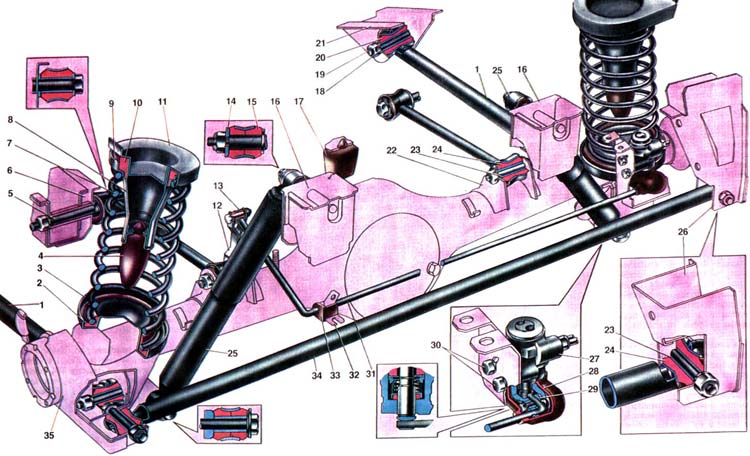 1. Нижняя продольная штанга; 2. Нижняя изолирующая прокладка пружины подвески; 3. Нижняя опорная чашка пружины подвески; 4. Буфер хода сжатия; 5. Болт крепления верхней продольной штанги; 6. Кронштейн крепления верхней продольной штанги; 7. Пружина подвески; 8. Опора буфера хода сжатия; 9. Верхняя обойма прокладки пружины; 10. Верхняя изолирующая прокладка пружины; 11. Верхняя опорная чашка пружины подвески; 12. Стойка рычага привода регулятора давления; 13. Резиновая втулка рычага привода регулятора давления; 14. Шайба шпильки крепления амортизатора; 15. Резиновые втулки проушины амортизатора; 16. Кронштейн крепления заднего амортизатора; 17. Дополнительный буфер хода сжатия; 18. Шайба распорной втулки; 19. Распорная втулка нижней продольной штанги; 20. Резиновая втулка нижней продольной штанги; 21. Кронштейн крепления нижней продольной штанги; 22. Кронштейн крепления верхней продольной штанги к балке моста; 23. Распорная втулка поперечной и продольной штанг; 24. Резиновая втулка верхней продольной и поперечной штанг; 25. Задний амортизатор; 26. Кронштейн крепления поперечной штанги к кузову; 27. Регулятор давления тормозов; 28. Защитный чехол регулятора давления; 29. Ось рычага привода регулятора давления; 30. Болты крепления регулятора давления; 31. Рычаг привода регулятора давления; 32. Обойма опорной втулки рычага; 33. Опорная втулка; 34. Поперечная штанга; 35. Опорная пластина кронштейна крепления поперечной штанги.