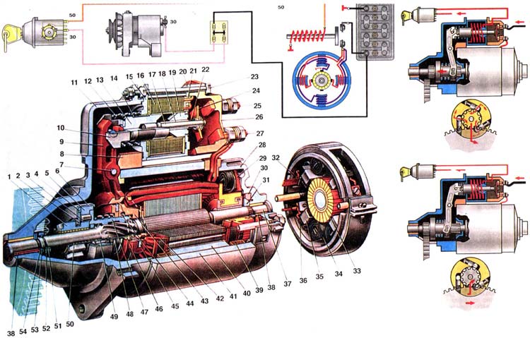 Для пуска двигателя применяется стартер СТ-221 мощностью 1,3 кВт, с электромагнитным включением шестерни привода, с роликовой обгонной муфтой и дистанционным управлением. С 1986 г. на автомобилях устанавливается взаимозаменяемый стартер 35.3708 с двухобмоточным тяговым реле и торцевым коллектором. Стартер СТ-221 представляет собой четырехшеточный, четырехполюсный электродвигатель постоянного тока со смешанным возбуждением и состоит из корпуса 41 с обмотками возбуждения, якоря с приводом, двух крышек 11 и 28 и тягового электромагнитного реле. Крышки и корпус стянуты в единое целое двумя шпильками, ввернутыми в крышку И. Внутри стального корпуса закреплены винтами четыре полюса 40. На полюсы надеты катушки обмотки. Корпус вместе с полюсами и катушками образует статор стартера. Две катушки обмотки статора являются сериесными, т.е. соединены с обмоткой якоря последовательно, а две другие шунтовыми, присоединенными параллельно обмотке якоря. Поэтому возбуждение стартера и называется смешанным. Оно обеспечивает сравнительно низкую частоту вращения якоря на холостом ходу без нагрузки, что уменьшает износ втулок подшипников вала якоря, облегчает условия работы обгонной муфты и предотвращает разнос якоря. Якорь стартера состоит из вала 37, сердечника с обмоткой 42 из медной ленты и коллектора 33, выполненного в виде пластмассовой втулки с залитыми в ней медными пластинами. Вал якоря вращается в двух металлокерамических втулках 38, запрессованых в крышки стартера и пропитанных маслом. Осевой свободный ход вала якоря регулируется подбором шайб 54 и должен быть в пределах 0,07-0.7 мм (у стартера 35.3708 - не более 0,5 мм). На переднем конце вала якоря установлен привод стартера, состоящий из роликовой обгонной муфты и шестерни 1. Назначение обгонной муфты - передавать крутящий момент от вала якоря стартера к венцу маховика при пуске двигателя, а после пуска, работая в режиме обгона, не допускать передачи крутящего момента от маховика на якорь. Иначе может произойти выброс обмотки якоря из пазов сердечника из-за "разноса" чрезмерно высокой частоты вращения якоря маховиком работающего двигателя. Обгонная муфта состоит из наружного кольца 5 с роликами 3 и внутреннего кольца, объединенного с шестерней 1 привода. Наружное кольцо имеет три паза с отверстиями, в которых находятся стальные ролики с пружинами, плунжерами и направляющими стержнями. Лазь для роликов - с переменной шириной. В широкой част* паза ролики могут свободно вращаться, а в узкой - заклиниваются между наружным и внутренним кольцами. Электромагнитное тяговое реле стартера служит для ввода шестерни привода в зацепление с венцом маховика и для замыкания цепи питания обмоток якоря и статора. Магнитную систему реле образуют фланцы 15 и 20, ярмо (окружающее обмотку) и сердечник 19, запрессованный во фланец 20. На каркасе из латунной трубки и пластмассовых щек намотана катушка реле. На стартерах выпуска 1981 г. имеется две обмотки: удерживающая и втягивающая. Обе обмотки намотаны в одну сторону. Начала обмоток припаяны к штекеру "50". Конец удэрживающей обмотки приварен к фланцу 20 реле (т.е. соединен с "массой"), а конец втягивающей обмотки соединен с нижним контактным болтом 27 реле. Стартер 35.3708 отличается от стартера СТ-221 применением торцевого коллектора и обмотками статора. Торцевой коллектор выполнен в в
