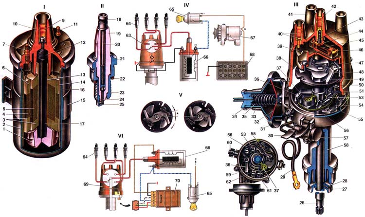 1. Изолятор; 2. Корпус катушки зажигания; 3. Изоляционная бумага обмоток; 4. Первичная обмотка; 5. Вторичная обмотка; 6. Изоляционная трубка первичной обмотки; 7. Клемма вывода конца первичной обмотки: 8. Контактный винт; 9. Клемма высокого напряжения; 10. Крышка; 11. Клемма "+E" вывода начала первичной и конца вторичной обмоток; 12. Пружина центральной клеммы; 13. Каркас вторичной обмотки: 14. Наружная изоляция первичной обмотки; 15. Скоба крепления; 16. Наружный магнитопровод; 17. Сердечник; 18. Контактная гайка; 19. Изолятор свечи зажигания: 20. Стержень; 21. Корпус свечи; 22. Уплотнительное кольцо; 23. Теплоотводящая шайба; 24. Центральный электрод; 25. Боковой электрод свечи зажигания; 26. Валик распределителя зажигания; 27. Маслоотражательная муфта валика; 28. Шайба: 29. Провод подвода тока и распределителю; 30. Запорная пружина крышки; 31. Корпус вакуумного регулятора; 32. Диафрагма; 33. Крышка вакуумного регулятора; 34. Гайка; 35. Пружина вакуумного регулятора; 36. Тяга вакуумного регулятора; 37. Смазочный фитиль (фильц) кулачка; 38. Опорная пластина регулятора опережения зажигания; 39. Ротор распределителя зажигания: 40. Боковой электрод с клеммой; 41. Крышка распределителя зажигания; 42. Центральный электрод с клеммой; 43. Уголек центрального электрода; 44. Центральный контакт ротора; 45. Резистор 5-6 ком для подавления радиопомех; 46. Наружный контакт ротора; 47. Пружина регулятора опережения зажигания; 48. Пластина центробежного регулятора; 49. Грузик регулятора опережения зажигания; 50. Изоляционная втулка; 51. Кулачок прерывателя; 52. Изоляционная колодка рычажка: 53. Рычажок прерывателя; 54. Стойка с контактами прерывателя; 55. Контакты прерывателя; 56. Подвижная пластина прерывателя; 57. Конденсатор 0,20-0,25 мкФ; 58. Корпус распределителя зажигания; 59. Подшипник подвижной пластины прерывателя; 60. Корпус масленки; 61. Винт клеммового зажима; 62. Стопорная пластина подшипника: 63. Распределитель зажигания; 64. Свечи зажигания; 65. Выключатель зажигания; 66. Катушка зажигания; 67. Генератор; 68. Аккумуляторная батарея; 69. Датчик-распределитель зажигания; 70. Коммутатор; 71. Угол опережения зажигания; 72. К источникам питания: 73. I.Катушка зажигания; 74. II.Свеча зажигания; 75. III.Распределитель зажигания; 76. IV.Схема классической системы зажигания; 77. V.Схема работы центробежного регулятора опережения зажигания. 78. VI.Схема бесконтактной системы зажигания.