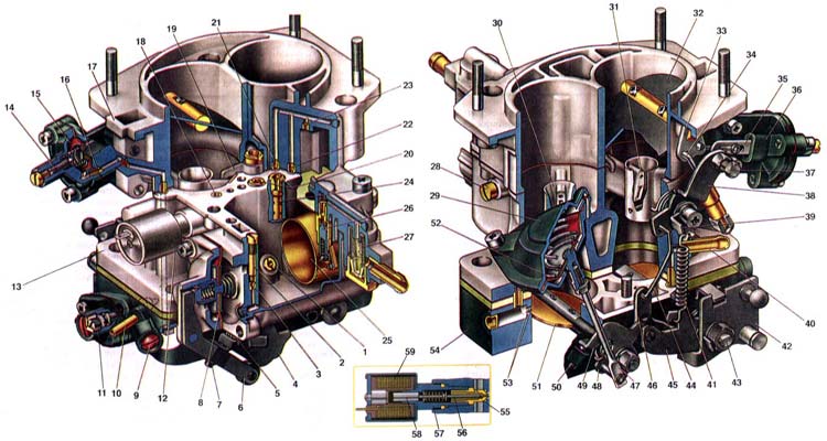 1. Главный топливный жиклер первой камеры; 2. Винт регулировки подачи топлива ускорительным насосом; 3. Перепускной жиклер ускорительного насоса; 4. Кулачок привода ускорительного насоса; 5. Возвратная пружина дроссельной заслонки первой камеры; 6. Рычаг привода ускорительного насоса; 7. Винт, ограничивающий закрытие дроссельной заслонки 1-й камеры: 8. Диафрагма ускорительного насоса; 9. Регулировочный винт состава смеси холостого хода с ограничительной втулкой; 10. Патрубок для подачи разрежения к вакуумному регулятору распределителя зажигания; 11. (регулировочный винт количества смеси холостого хода; 12. Запорный клапан топливного жиклера холостого хода; 13. Корпус карбюратора; 14. Регулировочный винт пускового устройства; 15. Диафрагма пускового устройства; 16. Воздушный жиклер пускового устройства; 17. Крышка карбюратора; 18. Воздушный жиклер системы холостого хода; 19. Распылитель ускорительного насоса; 20. Главные воздушные жиклеры; 21. Эмульсионный жиклер экономайзера (эконостата); 22. Топливный жиклер экономайзера; 23. Воздушный жиклер экономайзера; 24. Эмульсионная трубка: 25. Поплавок; 26. Игольчатый клапан: 27. Топливный фильтр; 28. Корпус топливного жиклера переходной системы второй камеры; 29. Пневмопривод дроссельной заслонки второй камеры: 30. Малый диффузор смесительной камеры; 31. Распылитель; 32. Воздушная заслонка; 33. Рычаг оси воздушной заслонки: 34. Телескопическая тяга привода воздушной заслонки; 35. Рейка пускового устройства; 36. Корпус пускового устройства; 37. Винт крепления тяги привода воздушной заслонки; 38. Трехплечий рычаг: 39. Кронштейн возвратной пружины: 40. Патрубок отсоса карторных газов; 41. Возвратная пружина рычагов; 42. Рычаг привода дроссельных заслонок: 43. Ось дроссельной заслонки первой камеры; 44. Тяга соединения приводов воздушной и дроссельной заслонок; 45. Рычаг, ограничивающий открытие дроссельной заслонки второй камеры; 46. Рычаг связи с воздушной заслонкой; 47. Шток пневмопривода дроссельной заслонки второй камеры; 48. Рычаг связанный с рычагом 49 через пружину; 49. Рычаг. жестко закрепленный на оси 43; 50. Винт для регулировки закрытия дроссельной заслонки 2-й камеры; 51. Дроссельная заслонка второй камены 52. Диафрагма пневмопривода дроссельной заслонки 2-й камеры 53. Отверстия переходной системы второй камеры; 54. Корпус дроссельных заслонок; 55. Топливный жиклер холостого хода; 56. Игл запорного клапана; 57. Корпус запорного клапана; 58. Якорь электромагнита; 59. Обмотка катушки электромагнита.