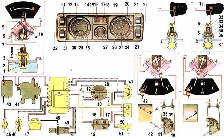 1. Терморезистор. 2. Контактная пружина. 3. Головка цилиндров. 4. Бумажный изоляционный патрон. 5. Корпус датчика. 6. Крышка датчика. 7. Балансир стрелки. 8. Постоянный магнит на оси стрелки. 9. Каркас с катушками указателя. 10. Диод защиты приборов. 11. Выключатель наружного освещения. 12. Контрольная лампа давления масла. 13. Указатель температуры охлаждающей жидкости. 14. Контрольная лампа заряда аккумуляторной батареи. 15. Блок контрольных ламп. 16. Контрольная лампа уровня тормозной жидкости. 17. Контрольная лампа стояночного тормоза. 18. Контрольная лампа включения противотуманного света. 19. Спидометр. 20. Счетчик пройденного пути. 21. Выключатель обогрева заднего стекла. 22. Заглушки винтов крепления щитка приборов. 23. Переключатель вентилятора отопителя. 24. Контрольная лампа дальнего света фар. 25. Контрольная лампа указателей поворота. 26. Контрольная лампа наружного освещения. 27. Вольтметр. 28. Комбинация приборов. 29. Указатель уровня топлива. 30. Контрольная лампа резерва топлива. 31. Выключатель противотуманного света в задних фонарях. 32. Воздушный фильтр датчика давления масла. 33. Пружина. 34. Подвижный контакт датчика. 35. Неподвижный контакт (соединен с массой). 36. Диафрагма. 37. Блок цилиндров. 38. Контакт сигнализации о резерве топлива. 39. Реостат датчика. 40. Подвижный контакт реостата. 41. Датчик указателя уровня и резерва топлива. 42. Рычаг с поплавком. 43. Аккумуляторная батарея. 44. Генератор. 45. Датчик контрольной лампы давления масла. 46. Датчик указателя температуры охлаждающей жидкости. 47. Датчик уровня тормозной жидкости. 48. Монтажный блок. 49. Выключатель зажигания. 50. Реле-прерыватель контрольной лампы стояночного тормоза. 51. Выключатель контрольной лампы стояночного тормоза. 52. I-Указатель температуры охлаждающей жидкости. 53. I-Щиток приборов. 54. I-Контрольная лампа давления масла. 55. IV-Указатель уровня топлива. 56. V-Электрическая схема включения контрольных приборов.