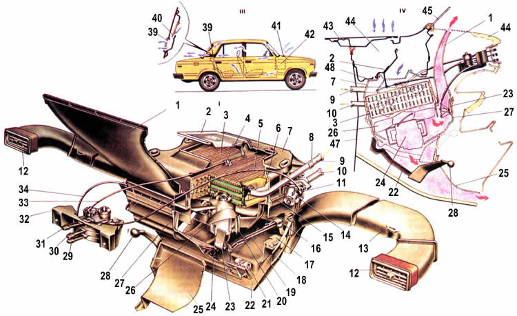 Салон отапливается воздухом, подогретым в радиаторе отопителя, который включен в систему охлаждения двигателя параллельно основному радиатору. От попадания задымленного воздуха из моторного отсека коробка воздухопритока герметизируется резиновым уплотнителем, поджимаемым к внутренней панели капота. Воздух поступает через решетку 41 капота 43 автомобиля в коробку 44 воздухопритока. расположенную под капотом в задней части передка кузова. Отражатель затем резко меняет направление движения воздуха, отделяет его от дождевой воды и затем воздух через люк кожуха 7 попадает в радиатор 3 отопителя. Пластмассовый кожух 7 радиатора закреплен четырьмя гайками снизу к усилителю щитка передка через уплотнительную прокладку 48. В верхней части кожуха имеется крышка 2 воздухопритока, регулирующая количество воздуха, поступающего в радиатор 3. Правый бачок радиатора внутри разделен на две части резиновой прокладкой. К бачку болтами прикреплены отводящая труба 9 и кран 14 с подводящей трубой 10. Концы этих труб соединены резиновыми шлангами с системой охлаждения двигателя. Выход труб в моторный отсек герметизируется резиновым уплотнителем, который крепится к щитку передка двумя болтами. Воздух, прошедший через радиатор отопителя, поступает в направляющий кожух 15 и кожух 27 вентилятора. Направляющий кожух 15 установлен между кожухами радиатора и вентилятора. Крепление осуществляется пружинными скобами к кожуху радиатора. В центре пластмассового направляющего кожуха с помощью пружинных скоб 20 на двух эластичных подушках установлен электродвигатель 24 с крыльчаткой 26 вентилятора. На внутренней стенке кожуха 27 вентилятора крепится дополнительное сопротивление 21 (резистор). Подключение или отключение его в цепь электродвигателя производится трехпозиционным переключателем на панели приборов. Дополнительный резистор обеспечивает малую и большую скорости вращения вентилятора. Из кожуха 27 вентилятора воздух поднимается через окно направляющего кожуха в воздухопровод 1 в верхней части панели приборов на обогрев ветрового стекла, по воздухопроводам 13 через сопла 12, расположенные с левой и правой стороны панели приборов, на обогрев стекол передних дверей, по воздухопроводу 25 внутренней вентиляции в нижнюю часть салона к ногам пассажиров. Снизу кожуха 27 вентилятора на скобах шарнирно установлена воздухораспределительная крышка 22, при открывании которой рычагом 28 воздух направляется к ногам пассажиров по воздухопроводу внутренней вентиляции. Управление отопителем осуществляется рукоятками 29. 30 и 31 на панели приборов, рычагами 37 управления боковыми соплами 12. рычагом 28 воздухораспределительной крышки 22 и переключателем электродвигателя вентилятора. Рукоятки 29. 30 и 31 надеты на концы рычагов и зафиксированы выступами, выштампованными на концах рычагов. Рычаги рукояток управления находятся на оси, установленной в кронштейне 32, который двумя болтами закреплен на поперечине панели приборов. С обеих сторон каждого рычага на ось установлены фрикционные резиновые шайбы, между которыми на оси поставлены неподвижные стальные шайбы. Все детали на оси поджаты резиновой подушкой. Верхняя рукоятка 31 управления краном отопителя соединена гибкой тягой 5 с рычагом крана и регулирует количество охлаждающей жидкости, поступающей из системы ох