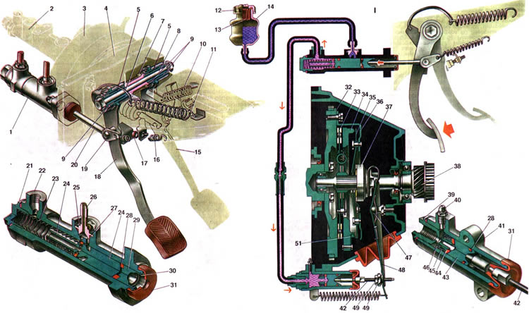 Педали сцепления и тормоза подвешены к кронштейну 4 на одной оси 8, выполненной в виде болта. Под его головку установлена упорная шайба, а на его конец навертывается гайка с пружинной шайбой. В ступицах педалей установлены наружные пластмассовые втулки 9. Поворот педалей происходит на внутренних металлических втулках 5, надетых на ось. Между педалью тормоза и щекой кронштейна установлена дистанционная пластмассовая втулка 7. Педаль сцепления шарнирно соединена с толкателем 20 и пластиной 19 оттяжной пружины. Они удерживаются на пальце шплинтом. Оттяжная пружина 16 удерживает педаль сцепления в исходном положении, при котором педаль упирается в колпачок ограничителя 17 хода педали. Другой конец толкателя входит в гнездо поршня 29 главного цилиндра. Ограничителем хода педали регулируют зазор между полусферическим концом толкателя и поршнем 29. К верхнему концу педали приварен кронштейн, в вырез которого заходит крючок 6; другой конец крючка соединен с сервопружиной И. Сервопружина стремится повернуть верхнюю часть педали в сторону выключения сцепления, чем значительно снижает усилие, прикладываемое к педали сцепления. Главный цилиндр 1 привода выключения сцепления крепится на двух шпильках к торцевой пластине кронштейна педалей. К этой же пластине крепятся вакуумный усилитель 3 с главным цилиндром 2 привода тормозов. В полости главного цилиндра установлены два поршня 24 и 29 и возвратная пружина 23. Она упирается одним концом в пробку 21, другим - в буртик поршня 24 и служит для возвращения поршней в исходное положение. За счет установки двух поршней уменьшаются радиальные нагрузки на поршень 24 при воздействии толкателя 20 на поршень 29, а также улучшается уплотнение поршней, так как между ними сжимается уплотнительное кольцо 28. Поршень главного цилиндра уплотнен резиновым кольцом, которое расположено в канавке поршня и создает герметичность в рабочей полости цилиндра. Чтобы по мере возрастания давления в рабочей полости одновременно улучшалось уплотнение поршня, в его хвостовике выполнен осевой канал, соединяющийся с радиальными отверстиями, которые выходят в канавку уплотнительного кольца. Когда давление в рабочей полости цилиндра возрастает, то по/- его воздействием уплотнительное кольцо распирается по радиусу, т. е. плотнее прилегает к зеркалу цилиндра. Одновременно уплотнительное кольцо является клапаном, через который полость цилиндра сообщается с бачком 14. Это происходит при крайнем заднем положении "поршней, когда уплотнительное кольцо н6 перекрывает компенсационное отверстие в корпусе цилиндра. Все детали удерживаются в полости цилиндра стопорным кольцом 30. Защитный колпачок 31 предохраняет полость цилиндра от загрязнения. В отверстиях корпуса цилиндра закреплены трубопровод, отводящий жидкость от главного цилиндра к рабочему, и штуцер 26, соединенный шлангом с бачком гидропривода. Штуцер 26 в гнезде корпуса уплотнен резиновой прокладкой 27 и крепится стопорной шайбой 25. Рабочий цилиндр 32 (см. рис. 13) привода выключения сцепления крепится двумя болтами к картеру 13 сцепления. Верхний болт одновременно крепит пластину оттяжной пружины 33, которая возвращает в исходное положение вилку выключения сцепления. В корпусе цилиндра расположен поршень 43 (см. рис. 14) с двумя уплотнительными кольцами. Заднее кольцо 28 установлен