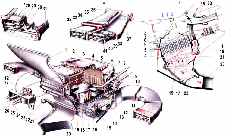 Пассажирский салон автомобиля отапливается воздухом, подогретым в радиаторе отопителя, который подключен к системе охлаждения двигателя параллельно основному радиатору. Воздух поступает через решетку капота автомобиля в коробку воздухопритока, расположенную в задней части передка кузова под капотом. Отражателем воздух резко меняет направление движения, отделяется от дождевой воды и поступает через люк кожуха 7 в радиатор отопителя. Пластмассовый кожух 7 радиатора закреплен четырьмя гайками снизу к усилителю щитка передка через уплотнительную прокладку. В верхней части кожуха имеется крышка 3 воздухопритока, регулирующая количество воздуха, который поступает в радиатор. Радиатор 5 в кожухе уплотняется резиновой прокладкой. Правый бачок радиатора разделен перегородкой на две части, к которым закреплены отводящая труба 8 и кран 10 с подводящей трубой 9. Концы этих труб подсоединены к системе охлаждения двигателя. Выход подводящей и отводящей труб в моторный отсек загерметизирован резиновым уплотнителем. На автомобиле может быть установлен отопитель с алюминиевым радиатором, взаимозаменяемым с латунным. Алюминиевый радиатор имеет алюминиевую сердцевину и пластмассовые бачки, которые уплотняются между собой резиновыми уплотнительными прокладками. Для улучшения эффективности работы радиатора в алюминиевые трубки его вставляются пластмассовые турбулизаторы, не допускающие ламинарного движения охлаждающей жидкости по трубкам радиатора. Воздух, прошедший через радиатор 5 отопителя, поступает в направляющий кожух 14 и затем кожух 21 вентилятора. Кожух вентилятора закреплен скобами к кожуху 7 радиатора. В центре пластмассового направляющего кожуха с помощью пружинных скоб установлен электродвигатель 19 с крыльчаткой 4 вентилятора. На передней стенке кожуха 21 вентилятора с внутренней стороны находится добавочное сопротивление 16 (резистор). Отключение и подключение его в цепь электродвигателя трехпозиционным переключателем, установленным на панели приборов, обеспечивает малую и большую скорость вращения вентилятора. Снизу кожуха 21 вентилятора установлена воздухораспределительная крышка 17, которая открывается и закрывается рычагом 22. Управление отопителем осуществляется рукоятками 24, 25. 26 на панели приборов, рычагами 30 управления боковыми соплами, рычагом 22 воздухораспределительной крышки и переключателем электродвигателя вентилятора. Пластмассовые рукоятки 24, 25 и 26 надеты на концы рычагов и зафиксированы выступами, выштампованными на концах рычагов. Выступы у верхнего и среднего рычагов направлены вниз, у нижнего - вверх. Рычаги рукояток управления находятся на оси, установленной неподвижно в кронштейне 23, который двумя винтами закреплен на поперечине панели приборов. С обеих сторон каждого рычага на ось установлены фрикционные резиновые шайбы, между которыми на лыску оси поставлень неподвижные стальные шайбы. Все детали на оси поджимаются резиновой подушкой. Верхняя рукоятка 26 управления краном отопителя связана гибкой тягой 6 с краном 10 и регулирует количество жидкости, поступающей из системы охлаждения в радиатор отопителя. Рукоятка 25 управления крышкой воздухопритока. связанная гибкой тягой 2 с рычагом крышки, регулирует количество свежего воздуха, поступающего в отопитель. Рукоятка 24 управлен