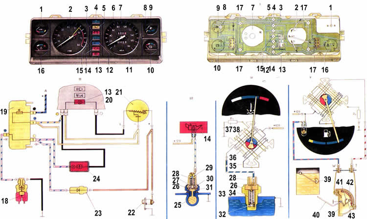 1. Эконометр, 2. Тахометр; 3. Контрольная лампа разряда аккумуляторной батареи; 4. Контрольная лампа указателей поворота; 5. Контрольная лампа воздушной заслонки карбюратора; 6. Суточный счетчиц пройденного пути; 7. Спидометр; 8. Контрольная лампа резерва топлива; 9. Указатель уровня топлива; 10. Вольтметр; 11. Счетчик пройденного пути; 12. Контрольная лампа дальнего света фар; 13. Контрольная лампа стояночного тормоза; 14. Контрольная лампа давления масла; 15. Контрольная лампа габаритного света; 16. Указатель температуры; 17. Лампы освещения комбинации приборов; 18. Датчик недостаточного уровня тормозной жидкости; 19. Монтажный блок; 20. Комбинация приборов; 21. Реле-прерыватель контрольной лампы стояночного тормоза; 22. Выключатель контрольной лампы стояночного тормоза: 23. Диод для проверки исправности контрольной лампы уровня тормозной жидкости; 24. Контрольная лампа уровня тормозной жидкости: 25. Блок цилиндров; 26. Корпус датчика; 27. Подвижный контакт; 28. Крышка датчика; 29. Воздушный фильтр датчика; 30. Неподвижный контакт: 31. Диафрагма; 32. Терморезистор; 33. Головка цилиндров: 34. Бумажный изоляционный патрон; 35. Каркас с катушками указателя; 36. Магнит возврата стрелки к началу шкалы; 37. -1-ермокомпенсационный резистор; 38. Постоянный магнит; 39. Датчик указателя уровня и резерва топлива; 40. Рычаг с поплавком; 41. Контакт сигнализации о резерве топлива; 42. Реостат датчика; 43. Подвижный контакт реостата; 44. А.К штекеру "87" реле зажигания; 45. I.Схема соединений комбинации приборов (вид с обратной стороны); 46. II.Схема включения контрольных ламп тормозной системы; 47. III.Контрольная лампа давления масла: 48. IV.Указатель температуры охлаждающей жидкости: 49. V.Указатель уровня топлива.
