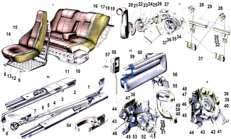 Передние сиденья раздельные, с индивидуальной регулировкой положения сиденья и наклона спинки. Каркасы сидений штампованные из стальных рам, к которым закреплены пружины, концы пружин для предотвращения скрипа покрыты поливинилхлоридной пленкой. Каркасы подушки 14 и спинки 15 соединены шарнирно. Сиденье установлено на двух салазках, которые закреплены тремя винтами и болтом к кронштейнам, приваренным к полу кузова. Салазки состоят из направляющих 7 и ползунов 6, отштампованных из листовой стали. К ползунам винтами закреплен каркас подушки. На внутренних ползунах установлена рукоятка 9 с защелкой. Соответственно направляющая 7 имеет фиксатор защелки. При повороте рукоятки 9 вниз защелка выходит из зацепления с фиксатором, и сиденье может перемещаться вперед или назад по направляющим. Рукоятка подпружинена и при отпускании ее защелка стопорит сиденье в заданном положении. Для облегчения передвижения сиденья в салазки вставлены по два ролика 5, между которыми установлены ограничители 3. Спинка 15 сиденья имеет грубую и тонкую регулировки угла наклона. Механизм наклона спинки расположен с внешней стороны сиденья. К усилителю 1 спинки с помощью пальца подсоединена тяга с винтом 8. на котором установлена рукоятка. Для облегчения регулировки служит пружина, соединенная с кронштейном ползуна и тягой. Винтовая нарезка позволяет винту вывертываться или ввертываться в тягу, передвигая тягу и изменяя наклон спинки. Вращая за рукоятку винт, можно плавно изменять угол наклона спинки. Для быстрого изменения угла наклона спинки нужно приподнять рукоятку с винтом и вывести винт из зацепления с фиксатором, в котором он установлен кольцевыми выточками. Заднее сиденье предусмотрено для трех человек. Подушка сиденья фиксируется в отверстиях 10 двумя шипами, приваренными к поперечине пола кузова. Спинка сиденья установлена вверху с помощью двух планок, которые входят в скобы, приваренные к полке задка. В нижней части спинка закреплена двумя язычками, приваренными к аркам колес. Язычки загнуты в скобы в нижних углах каркаса спинки. Каркасы подушки и спинки заднего сиденья также выполнены из тонких штампованных и проволочных рамок, к которым закреплены пружины с помощью металлических скоб. Концы скоб для предотвращения скрипа покрыты поливинилхлоридной пленкой. В спинку заднего сиденья встроен откидной средний подлокотник. Набивка сидений выполнена из эластичного пенополиуретана. Механизмы кузова Замок передней двери роторного типа. Зубья ротора при закрывании двери набегают на выступы фиксатора и поворачивают центральный валик 53 и сидящий на нем ховповик 39. который запирается выступом рычага 42 наружного привода. При полностью закрытой двери зуб ротора входит во впадину фиксатора, а опора центрального валика входит в контакт с сухарем 49 фиксатора и, выбирая зазор, препятствует вертикальному перемещению двери при движении автомобиля. Одновременно опора не позволяет самопроизвольно открываться двери при столкновении или опрокидывании автомобиля, когда вследствие деформации двери или кузова ротор замка стремится выйти из зацепления с фиксатором в продольном направлении автомобиля. Опора, заходя за стенки фиксатора, блокирует перемещение двери. Фиксатор двери закреплен тремя болтами на стойке кузова. Увеличенные отверстия в ст